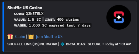 Shuffle.us normally drops several codes throughout the day to claim if you meet the wagering requirement for the given code.