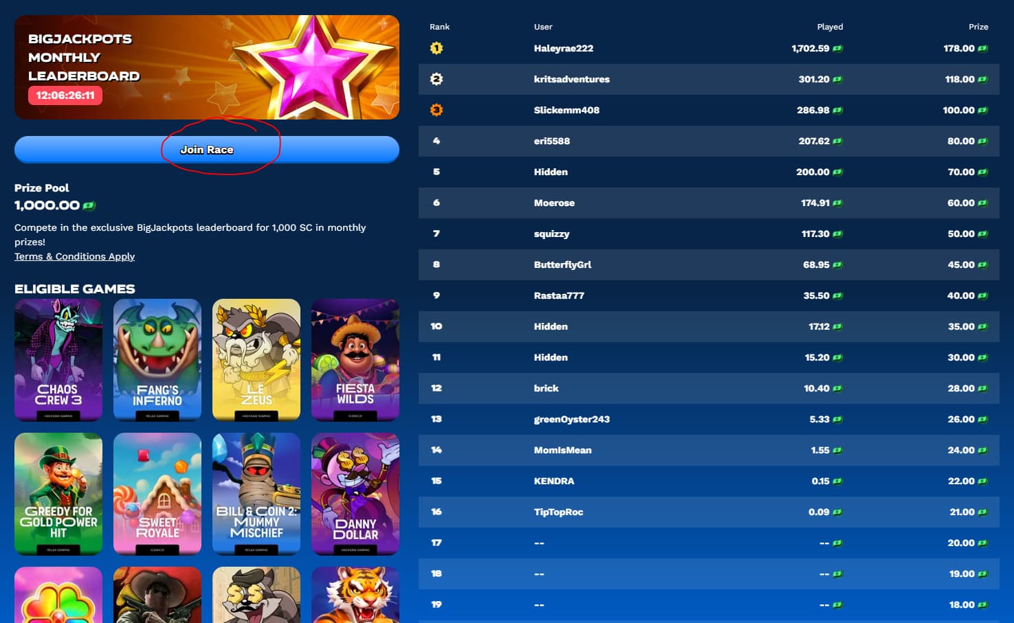 Scroll down until you see the 1,000 SC Leaderboard Contest and click Join Now.